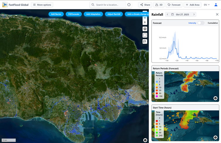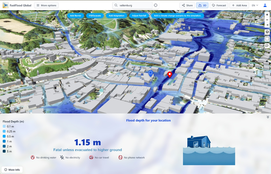 With FastFlood Global, users can type in an address or place name, choose between moderate or extreme rainfall scenarios, or use real forecast data, and within seconds view how flood water would move through streets, valleys, or cities. The results appear as detailed flood maps showing water will collect, how deep it could be, and which areas are most at risk.
