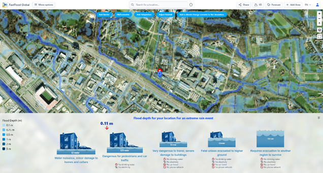 2. Understand the Impact: Click any location on the map, or use the "Analysis" panel. The platform translates flood depth into simple, clear impacts: