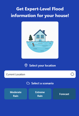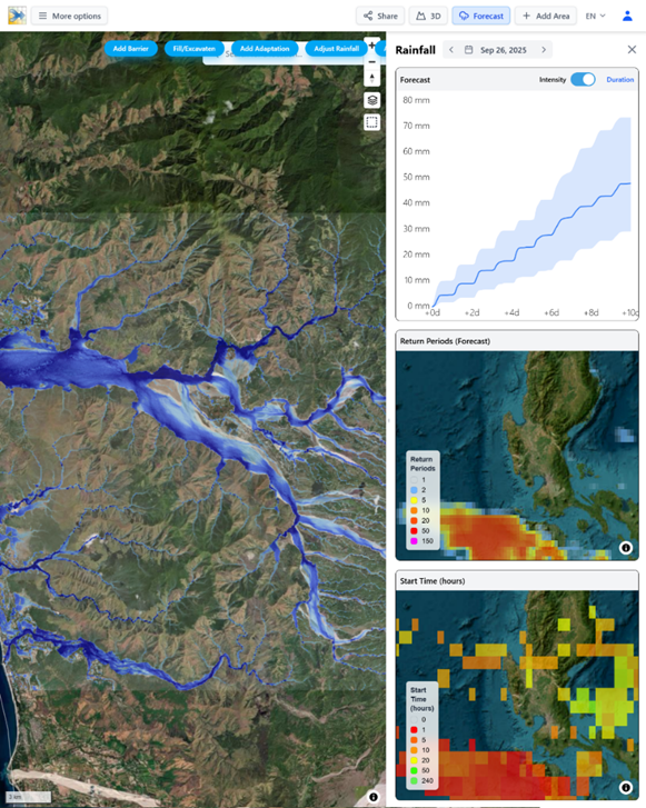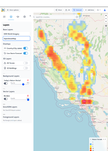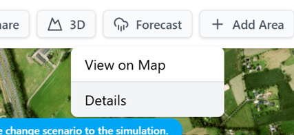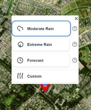 using the forecast button at the top-right of the screen. You might find another area to simulate if there is no precipitation expected for your location of choice. Just click anywhere on the map and select "Moderate", "Extreme" or "Forecast" for a quick view of the respective scenario.