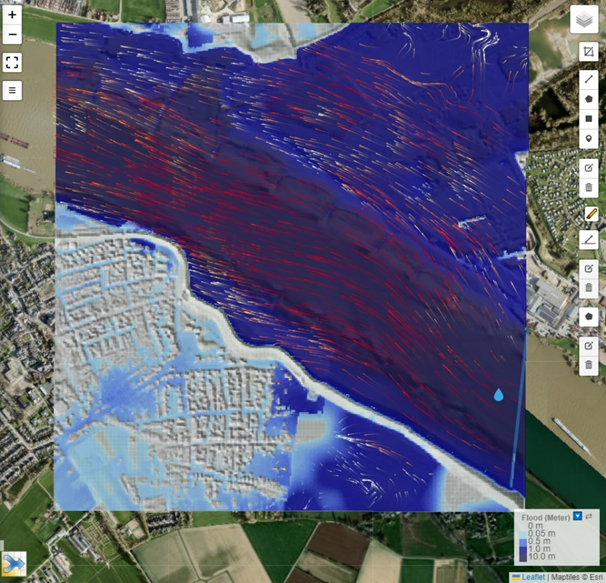 FastFlood detailed simulation results using bathymetry and topography data in the Rhine river, Netherlands.