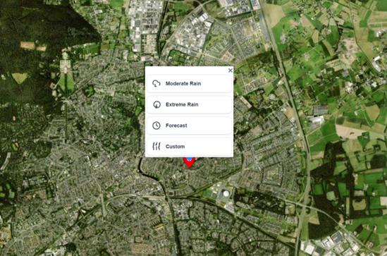 - Define Your Event: Instead of "Forecast," you will create a new scenario using the design storm concept. Click on moderate or extreme to immediately see a new simulation result. Or press custom to follow step 3 and set your own custom scenario.