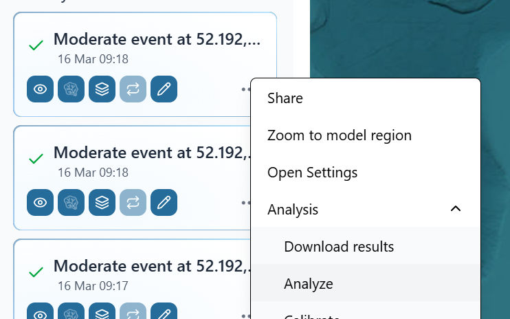 - Open the Analysis Panel: With your flood simulation active, open the "Analysis" panel. You can find this under the left menu, by pressing the three dots under the simulation in your history.