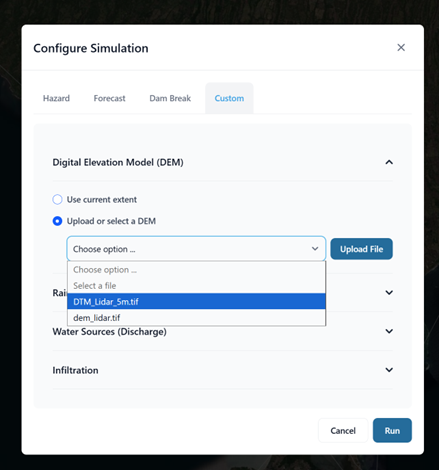 Here, you can upload and specify your own elevation dataset to be used by the model.